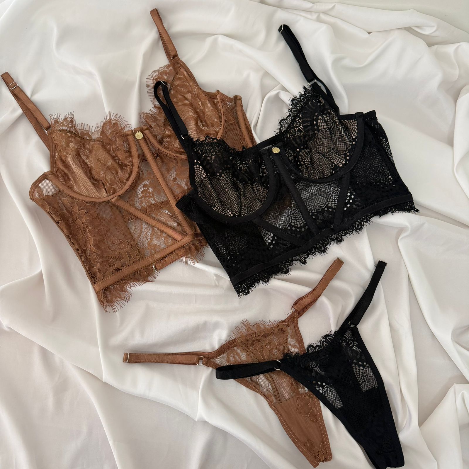 El set Borneo combina un crop top en encaje con espalda ajustable que se adapta perfectamente a tu figura, y un panty a juego que completa el conjunto con elegancia. Diseñado para resaltar tu feminidad con comodidad y estilo.